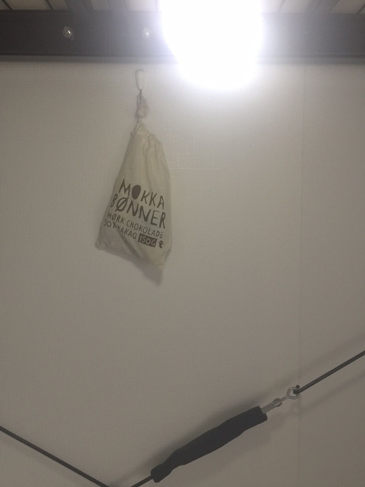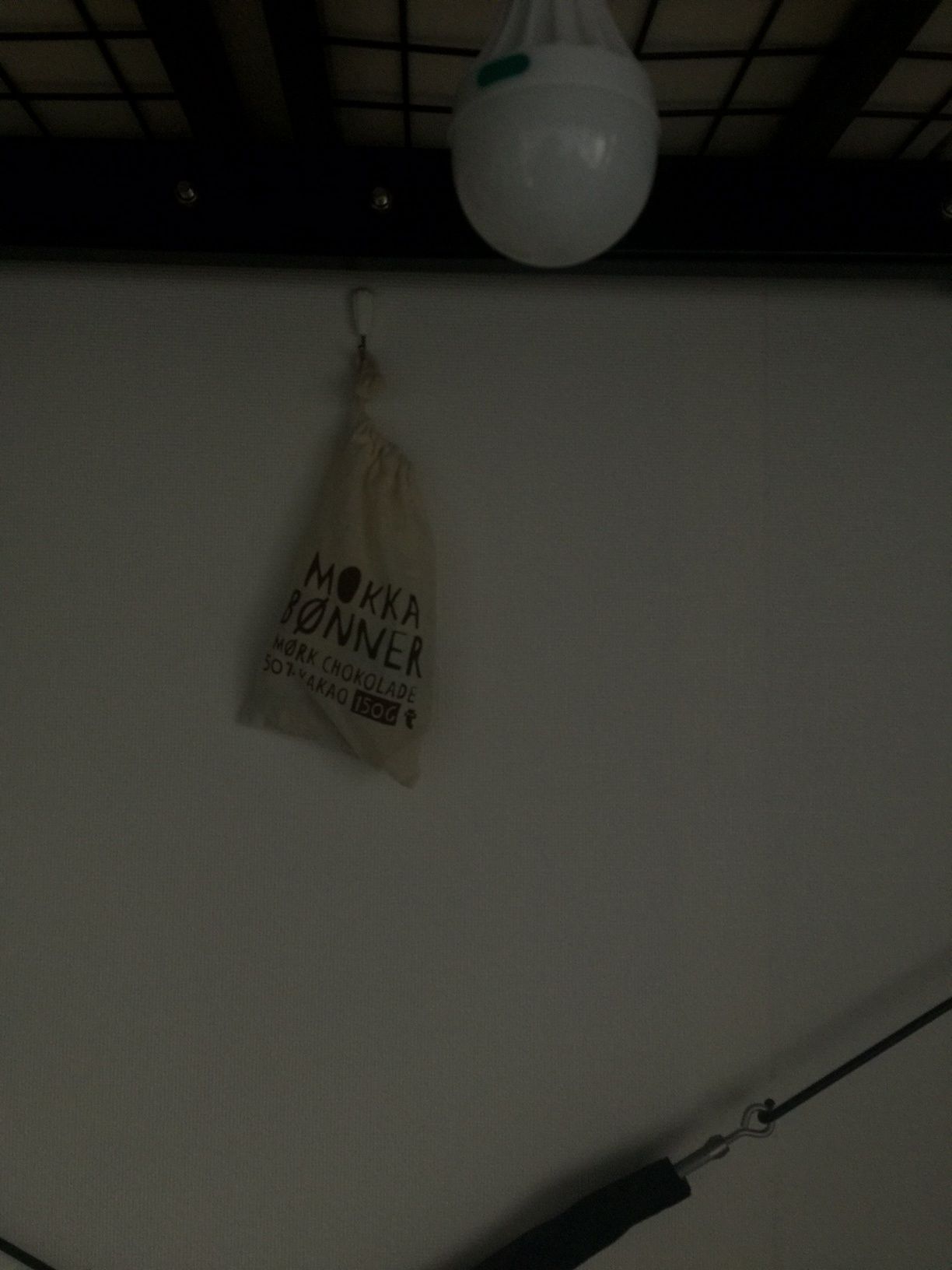 奥の壁にフライングタイガーのチョコが掛かっているのはわかりますか?