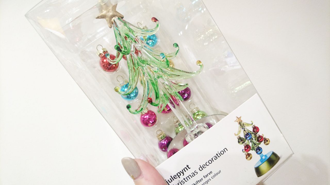 ガラス製のちいさなツリーで、飾り付け用のオーナメントもセットになっております。