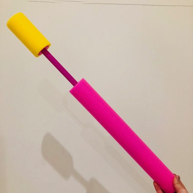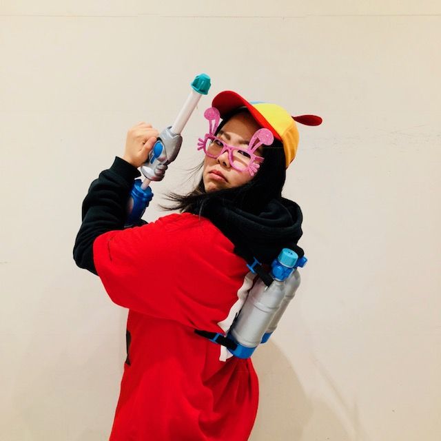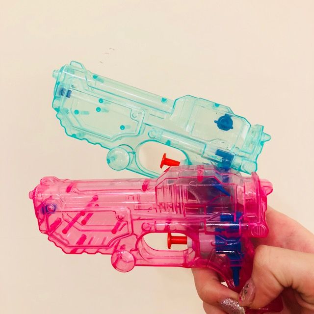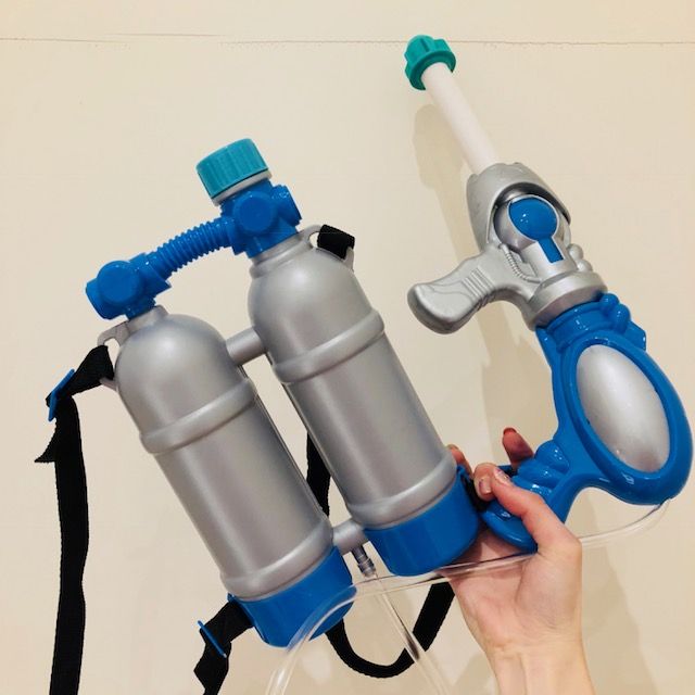 一般的な水鉄砲です。横の穴から水を入れて赤いレバーを押して発射します!