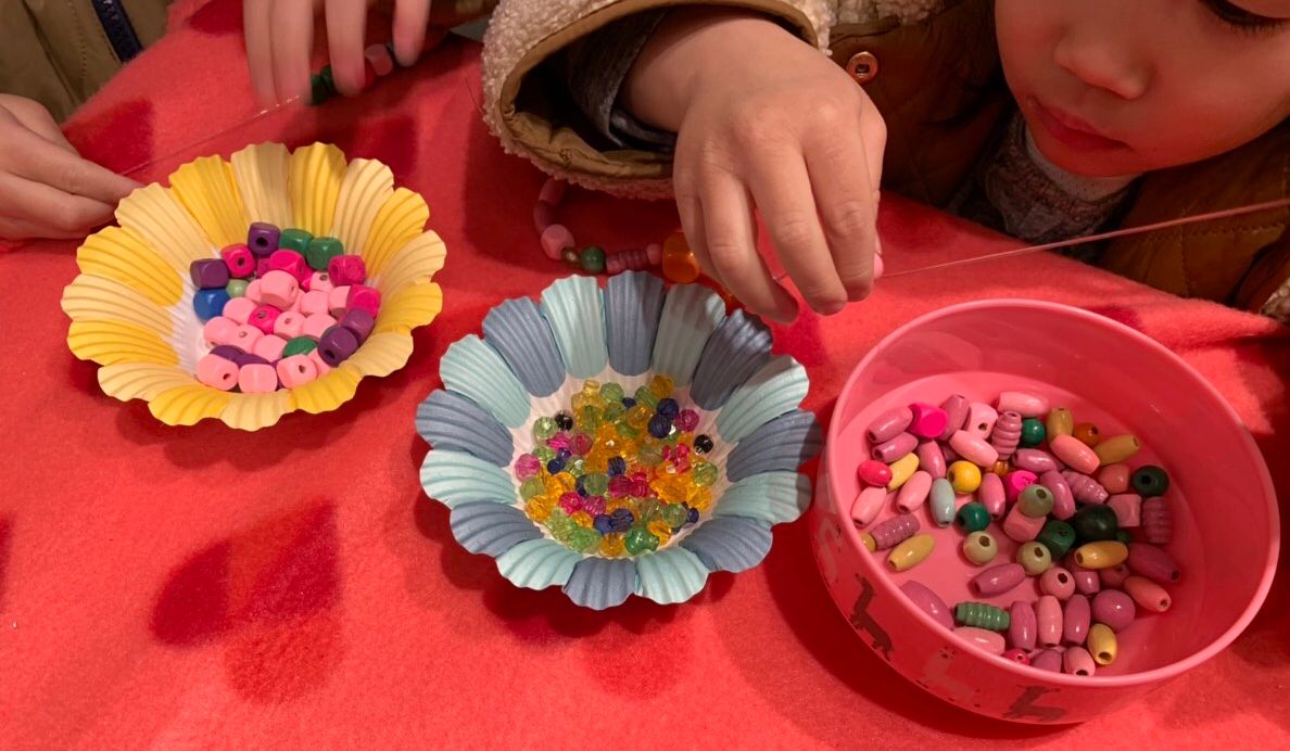 イベントではフライングタイガーの木製ビーズやキラキラのビーズを使って