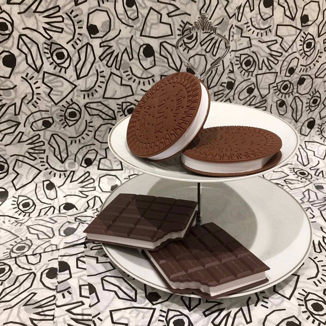 ケーキプレートにおいしいそうなチョコとビスケットが置いてありますが、