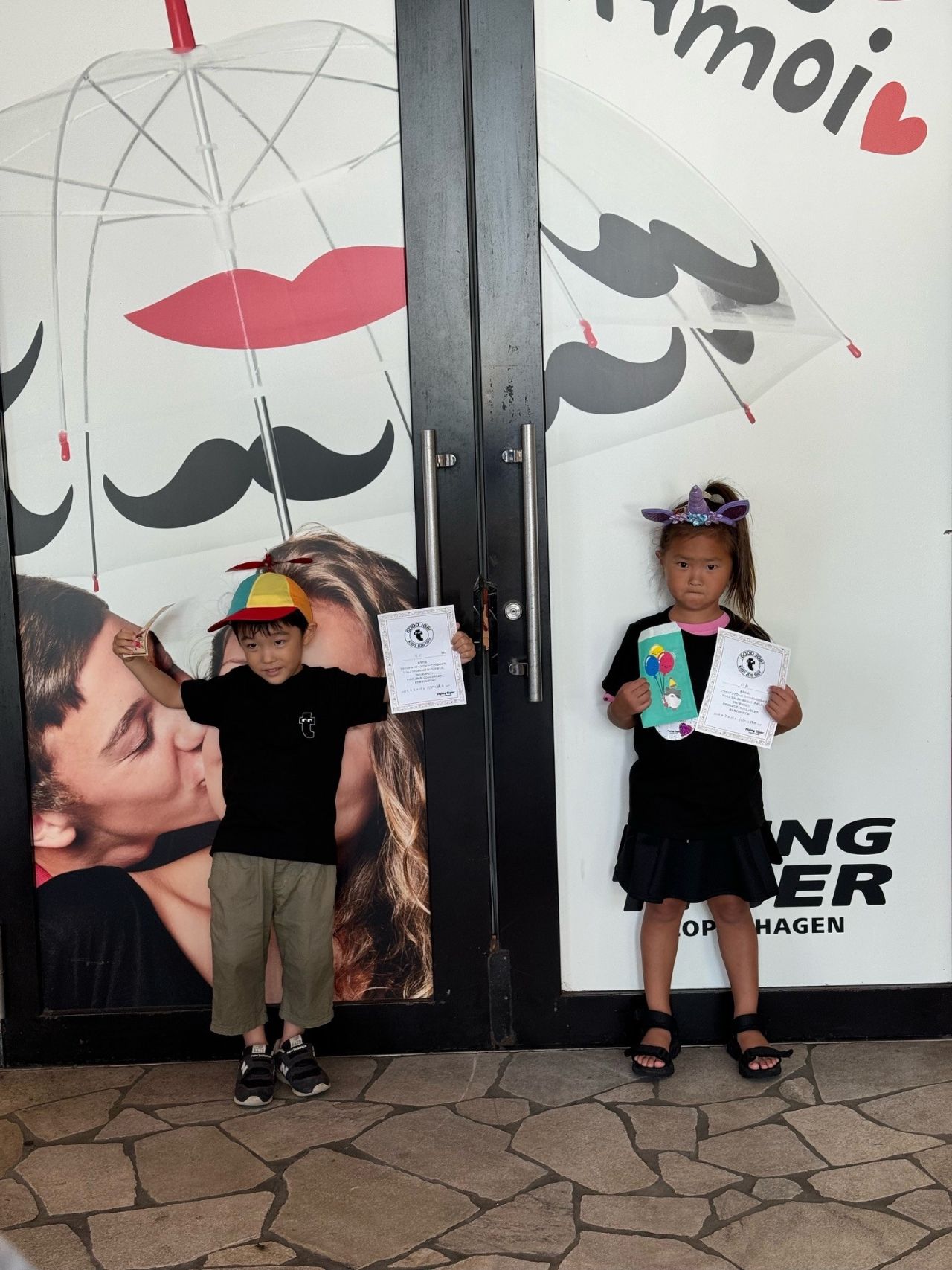 それぞれプロペラ帽子とユニコーンのカチューシャを選んで、