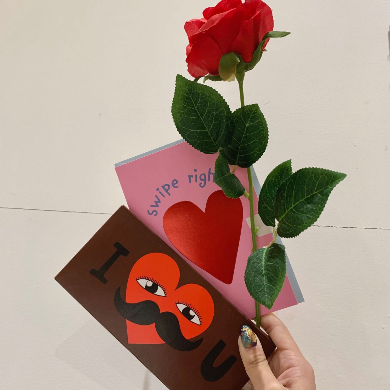 一輪の薔薇とI♡Uが書かれたチョコレート