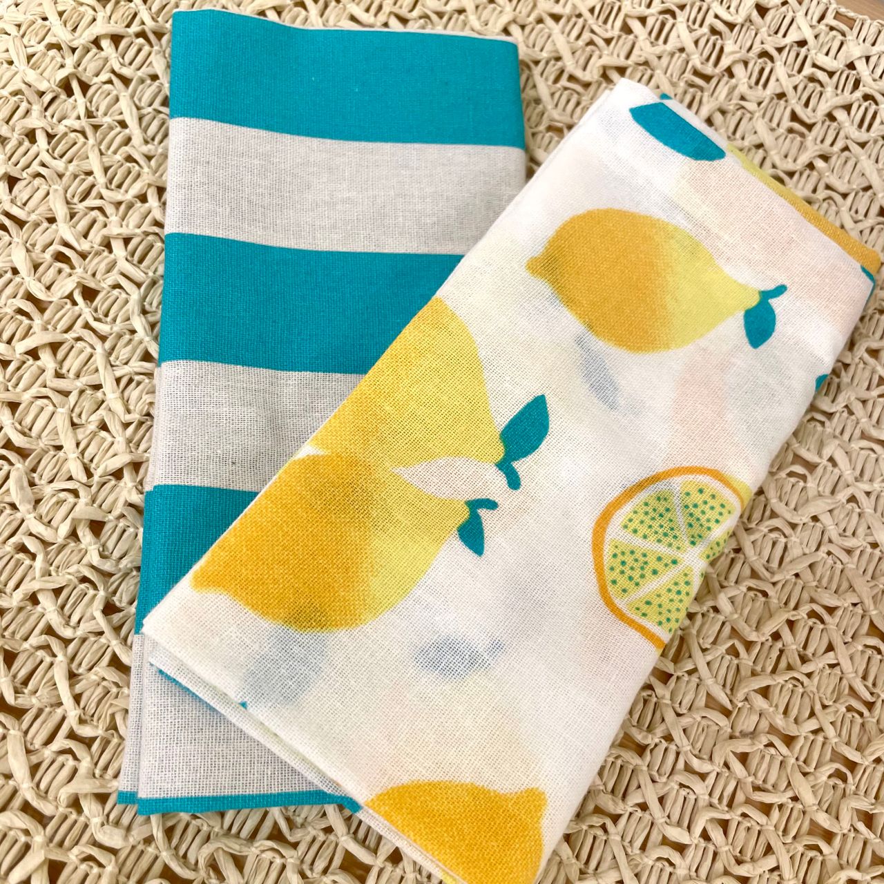 夏らしい青のストライプ模様と爽やかなレモンの柄の2種類です★
