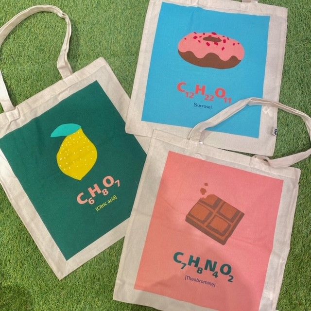 このよくわからない難しい化学式とチョコ、ドーナツ、レモンのデザイン…