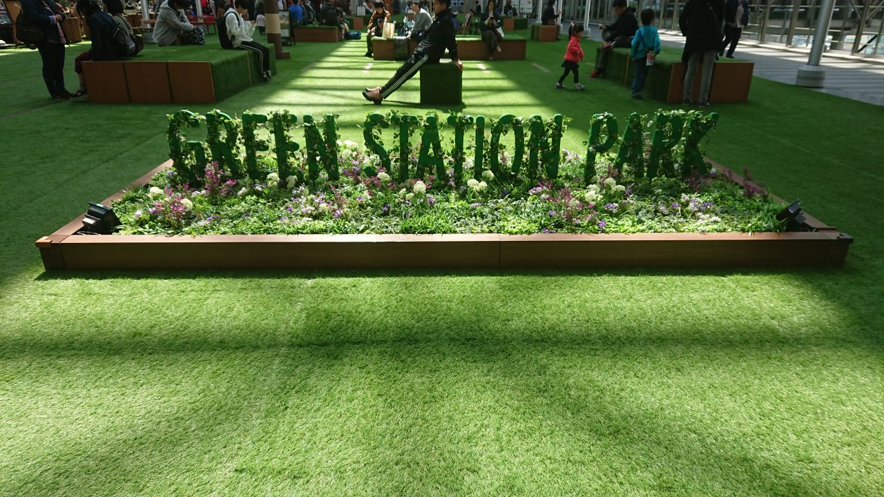 桜はありませんが、JR大阪駅5階 時空の広場も芝生が一面に広がっていて