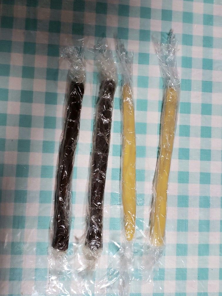 ④プレーン2本ココアパウダー入り2本をラップで四角く棒状になるようにまとめます