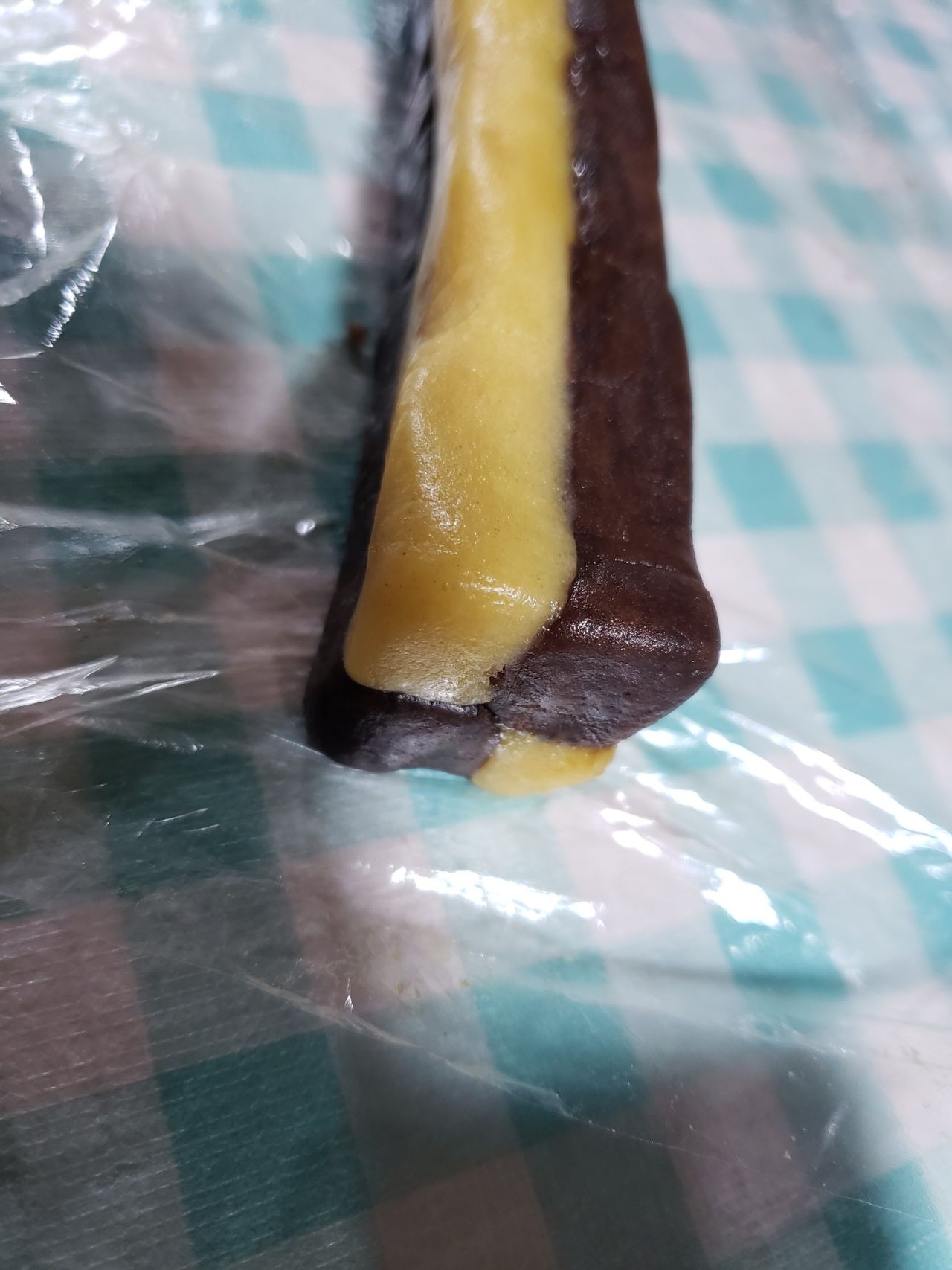 ⑥⑤をラップからだし卵黄を内側に付け同じ色が斜め同士になるように接着します