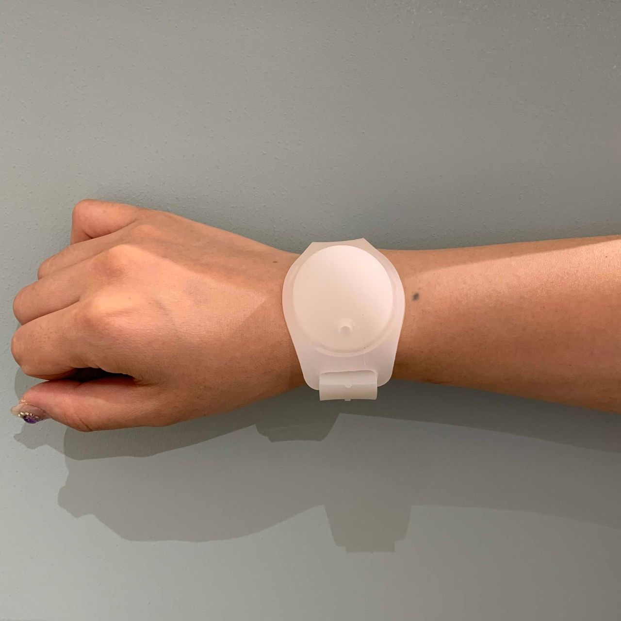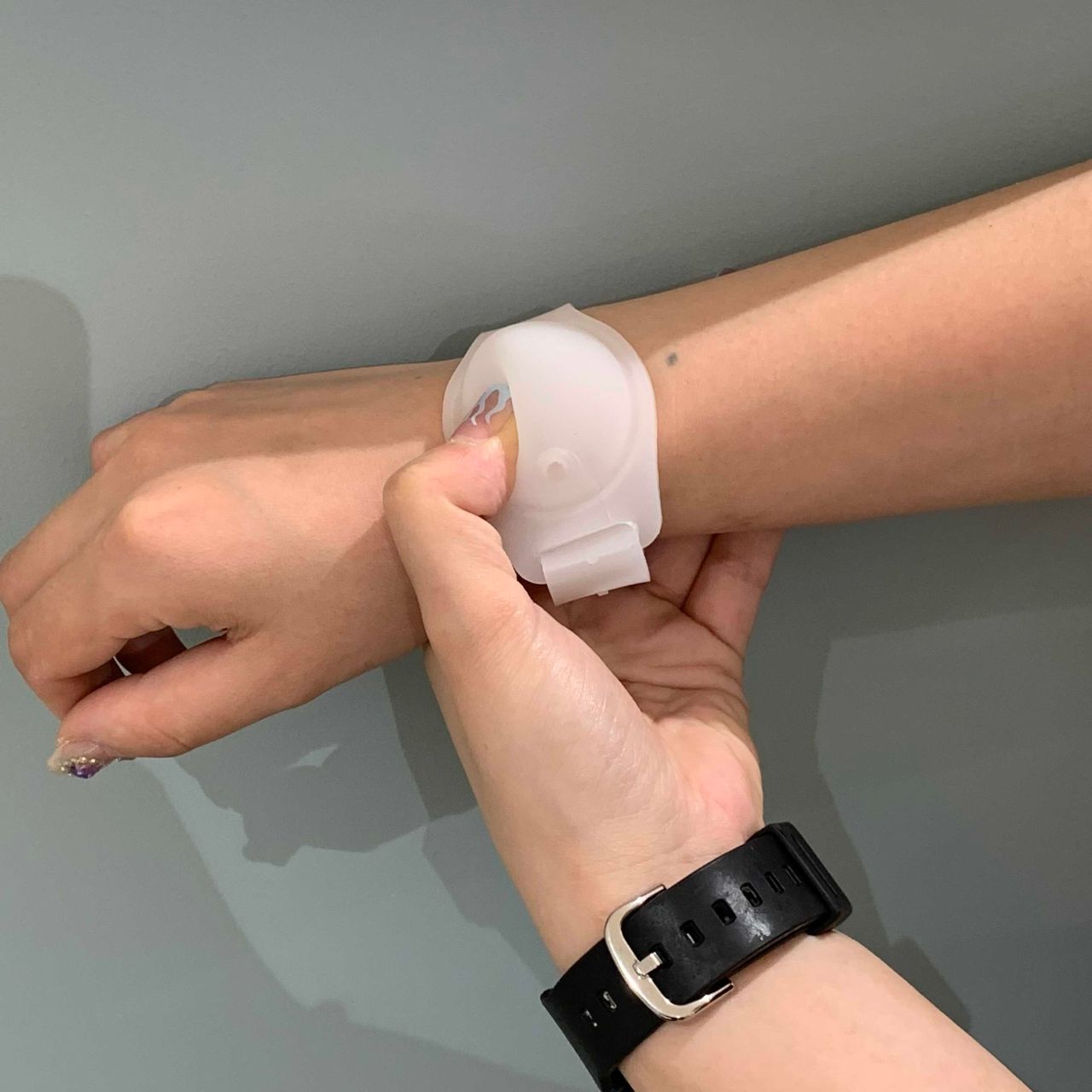 こちらはなんと腕時計のように付けるハンドジェル用のディスペンサーなんです!