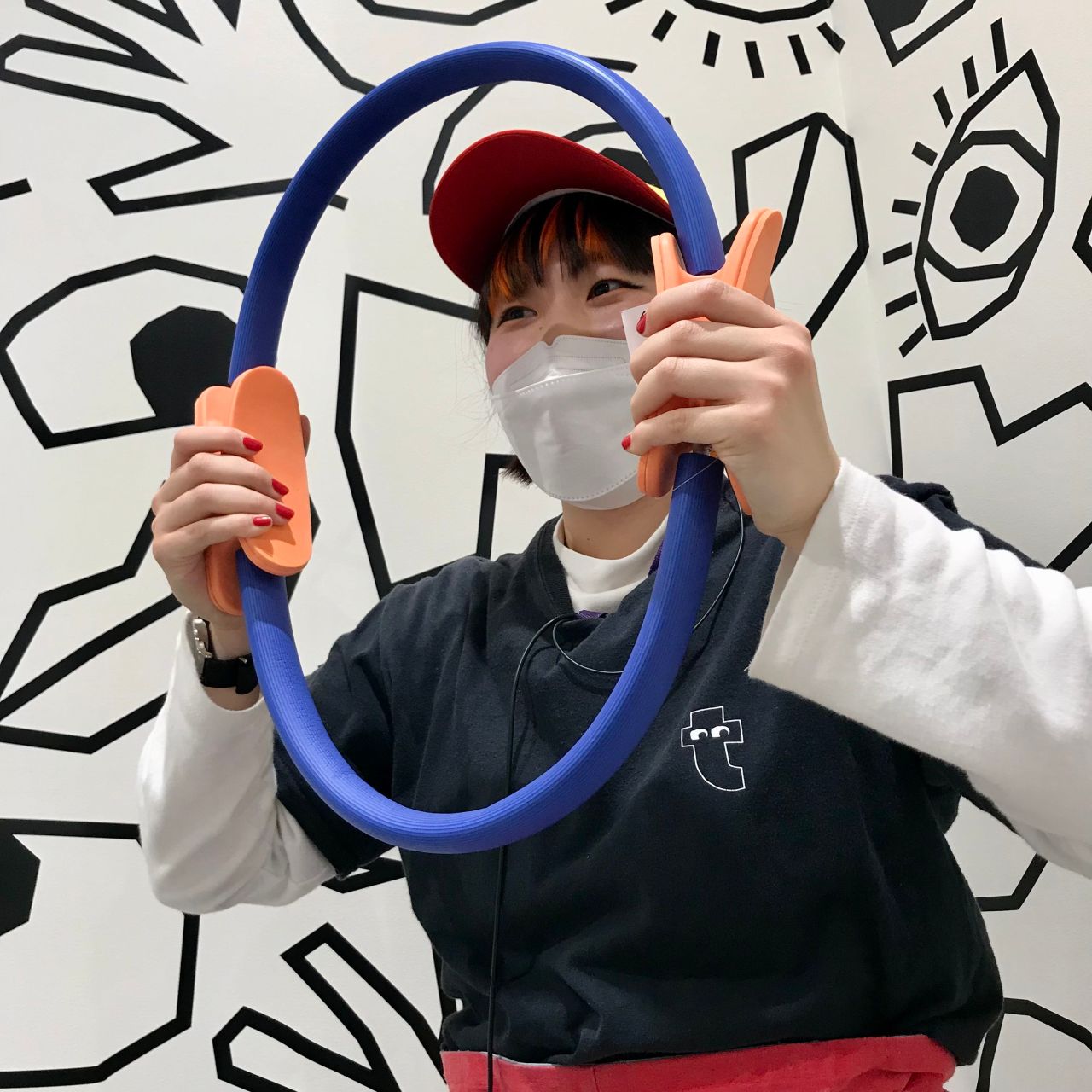 胸の前でリングを持ち、内側に向かって力を入れると、、、腕がプルプルします!笑