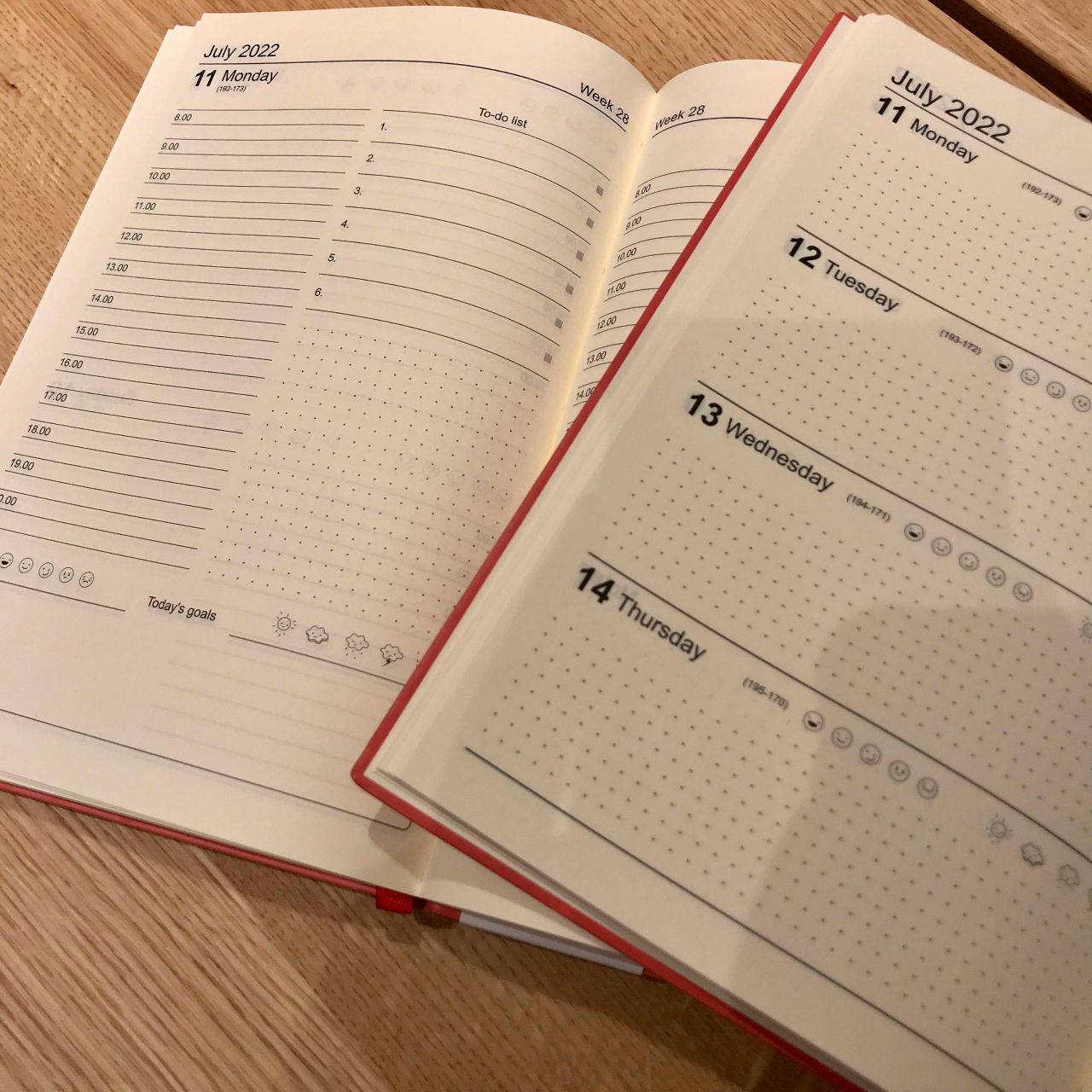 A5サイズのデイリー手帳(左上のもの)には、TO DOリストや、時間ごとに区切られたメモ欄もあります