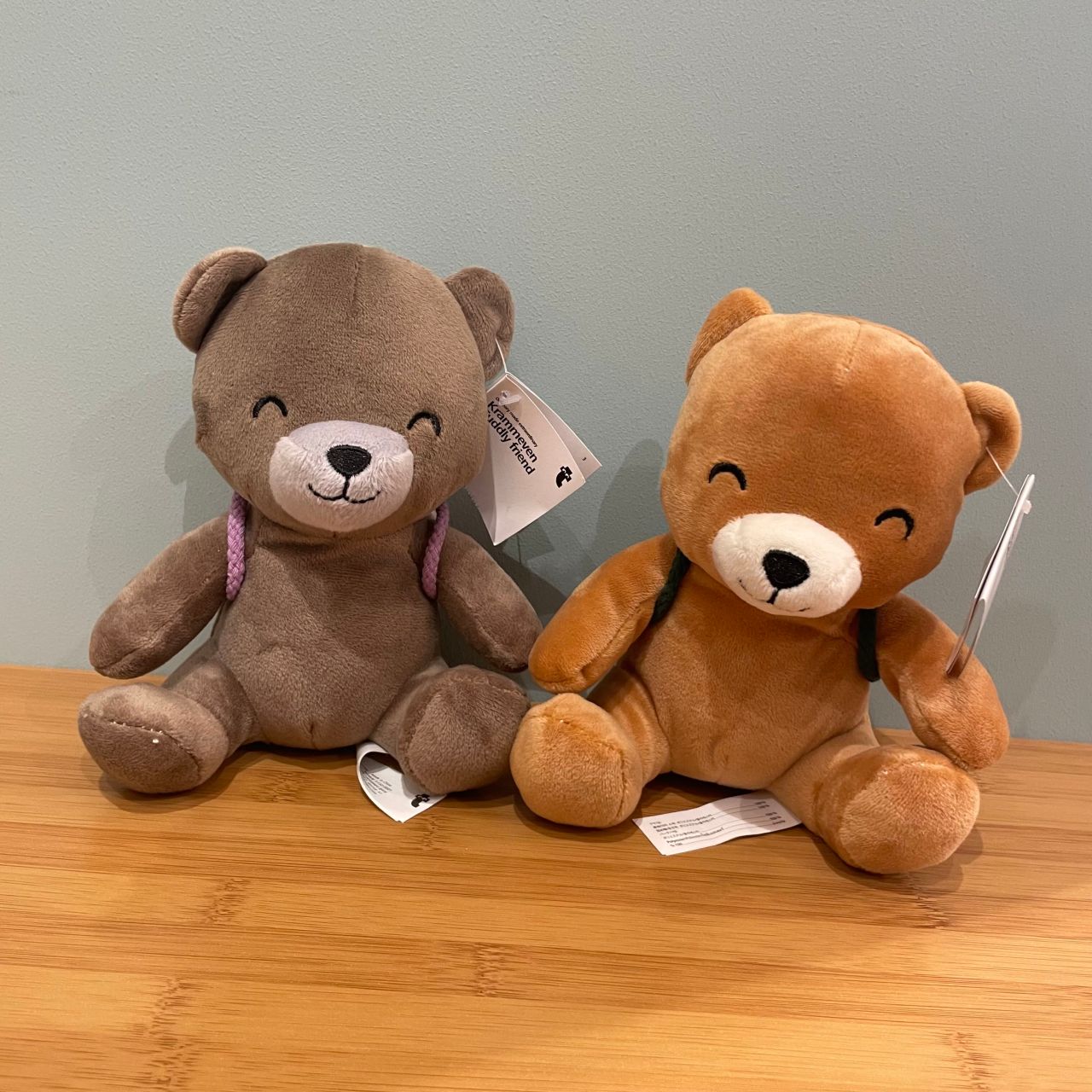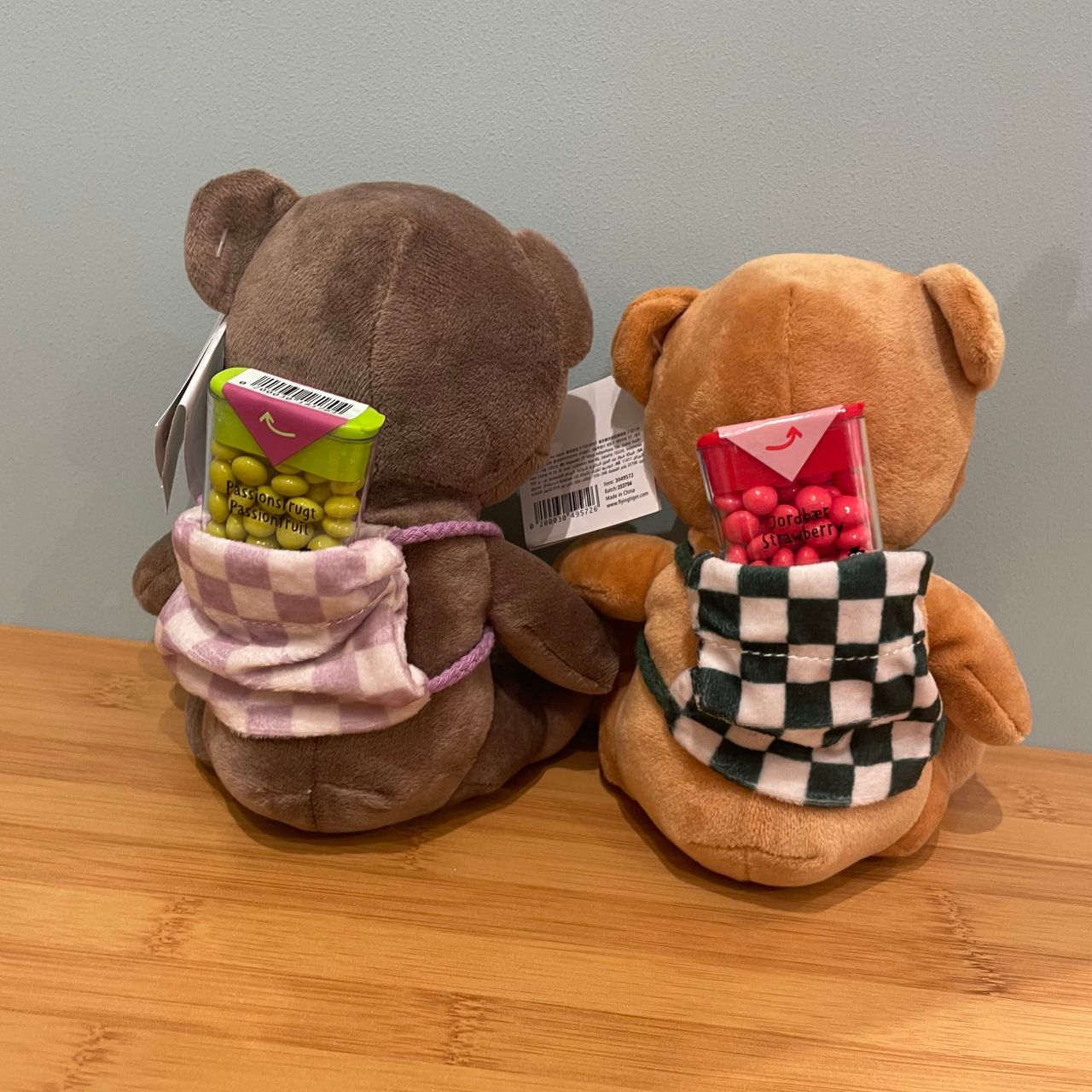 チェック柄のリュックを背負ったクマさんたち