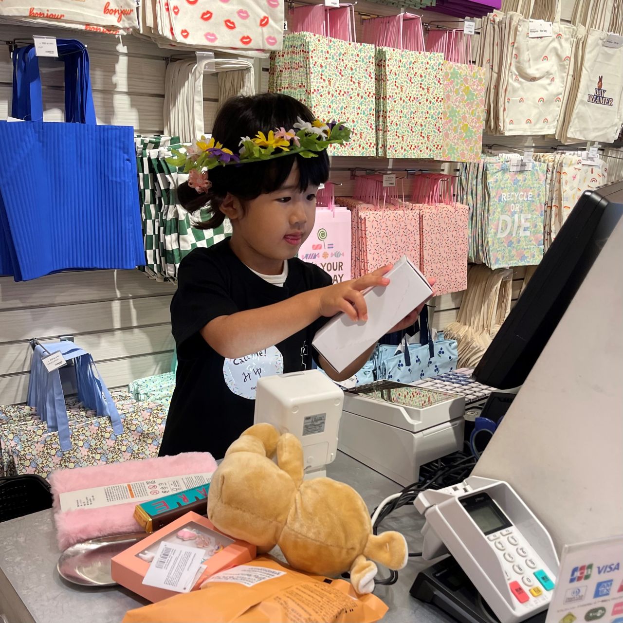 ふたりとも お店屋さんごっこがだいすき! 本物のレジに触れるのは初めてということでとっても楽しみにしてくれていた様子♡