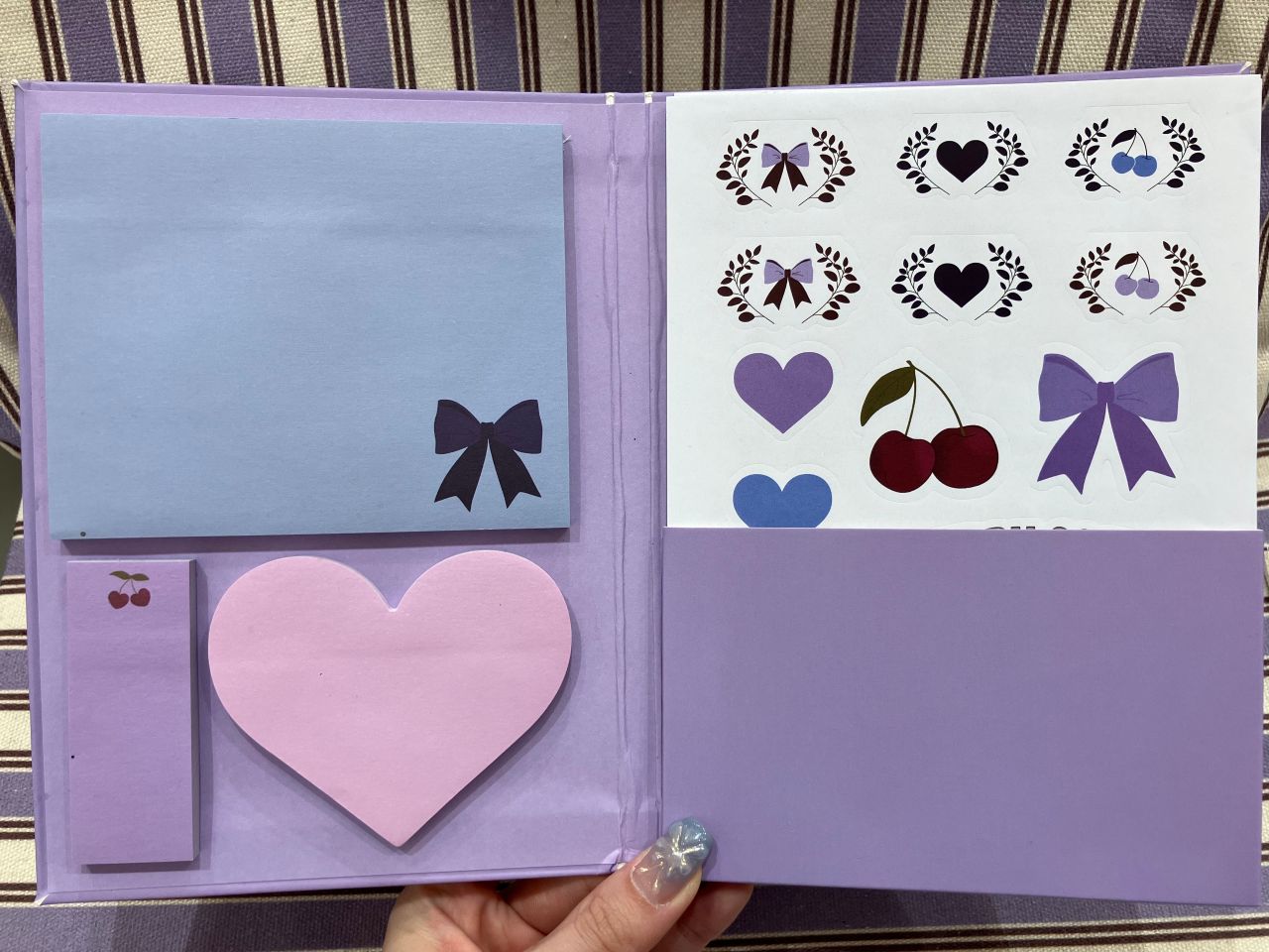 開くと中には3種類のふせんに加え、たくさん使えるステッカーがなんと15枚もはいっています!!