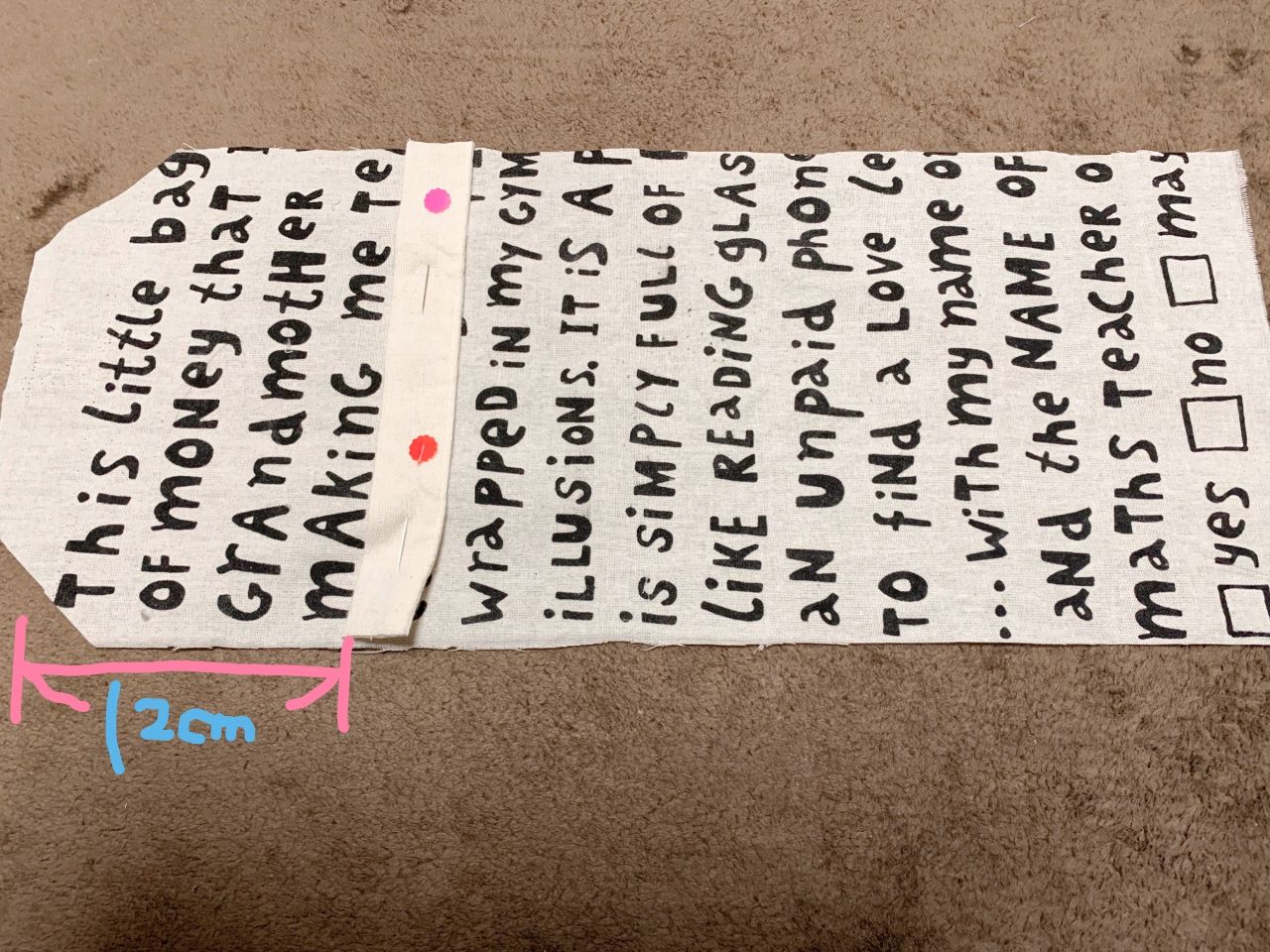 1枚をカットした側の端から12cmの位置にトートバックの持ち手をマチ針で留めておきます。