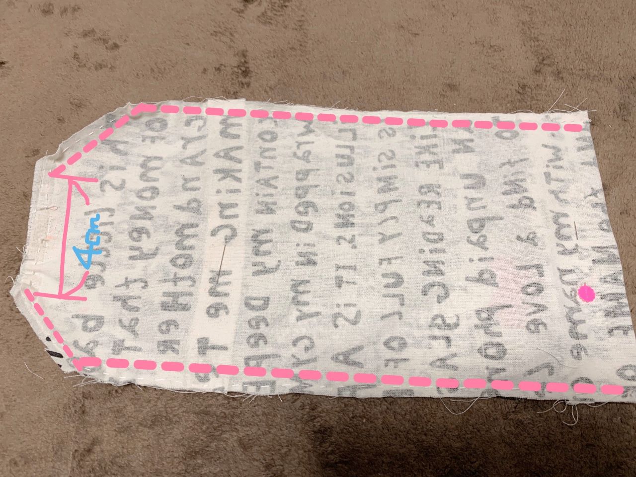 角を切り落とした方の返し口の部分を4㎝あけ、周りを縫い代1cmを残しながら縫い合わせます。