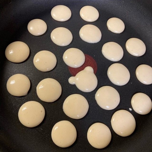 ④濡れ布巾に置いた状態でフライパンに生地を絞っていきます!