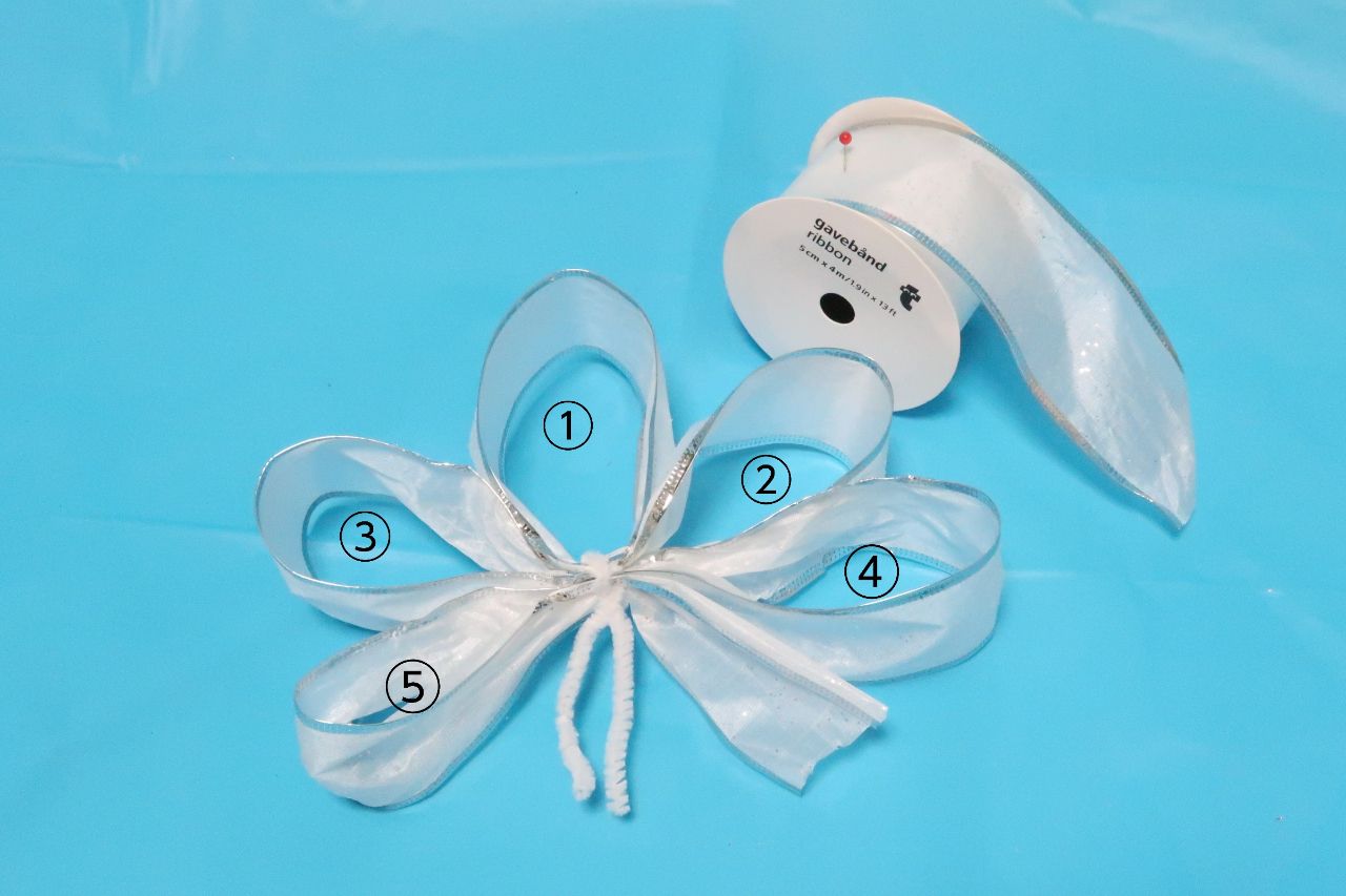 ③太いリボンで5つ輪をつくり、真ん中をモールで留めます。