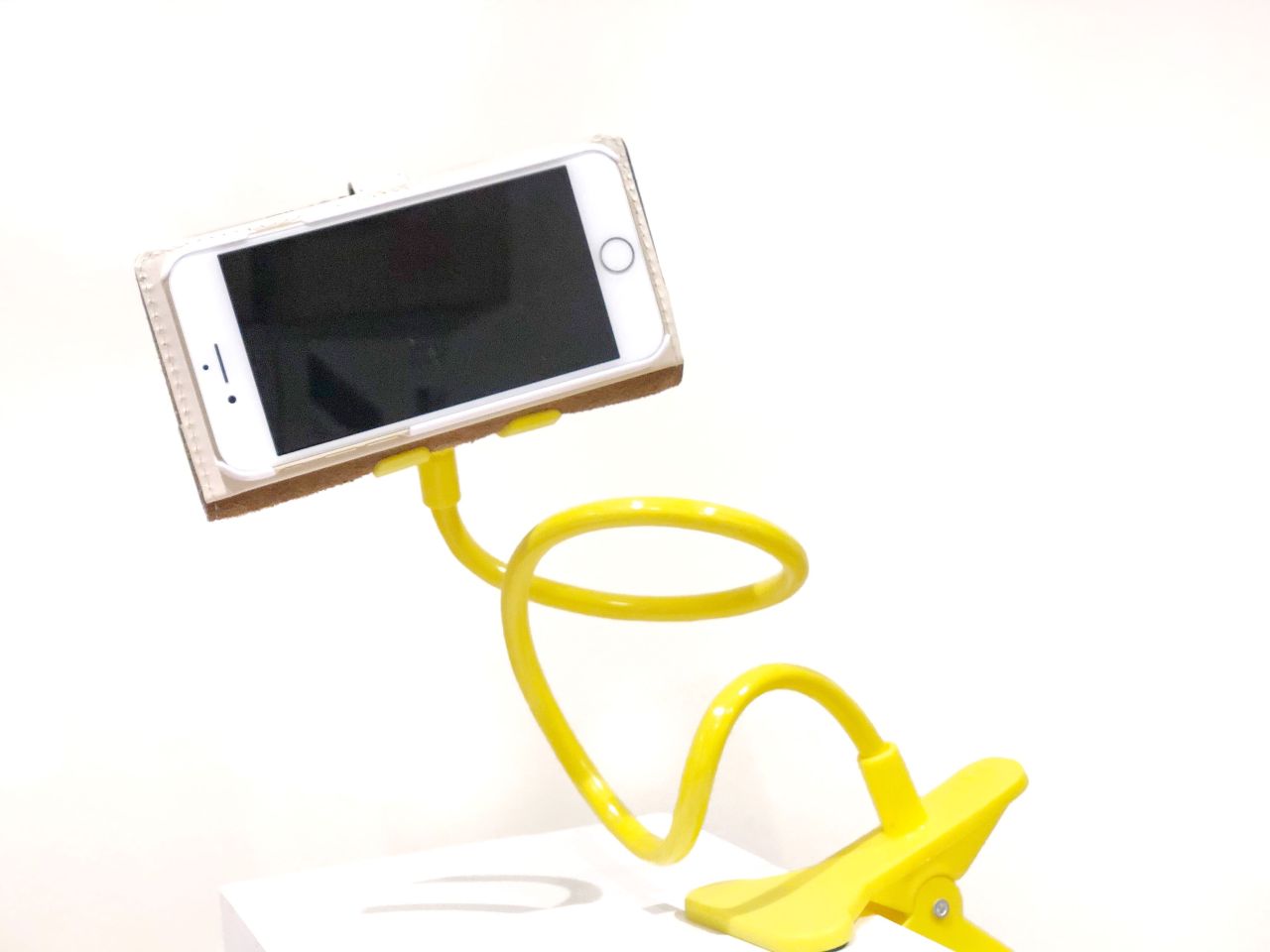 片方のクリップをスマートフォンを固定したい所に挟み、もう片方のクリップにはスマートフォンを挟むだけ!