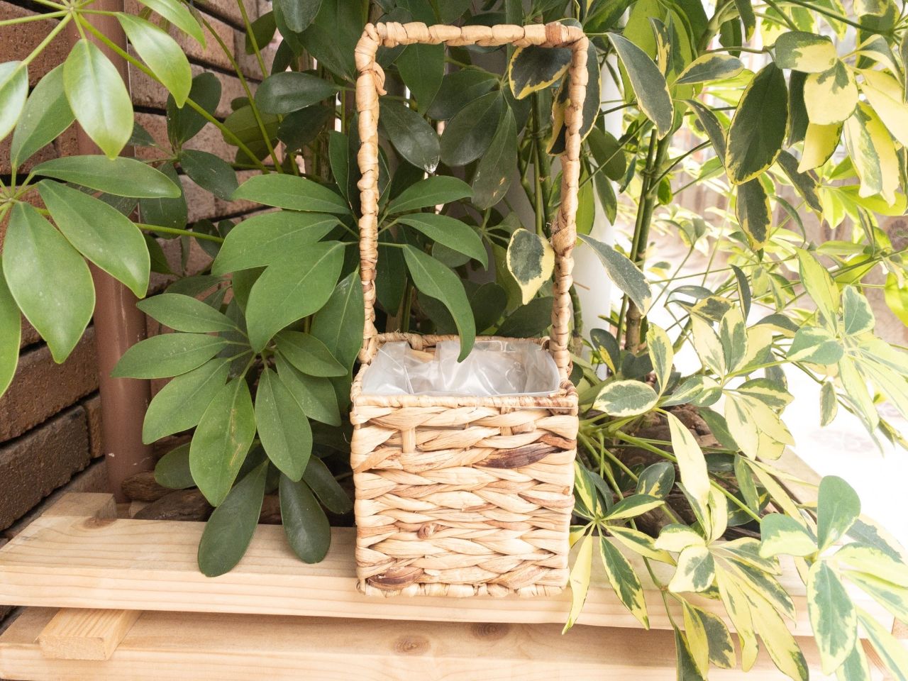 バスケットの中にビニールが付いており、フラワーポットとして小さな観葉植物を入れて飾ることが可能です。