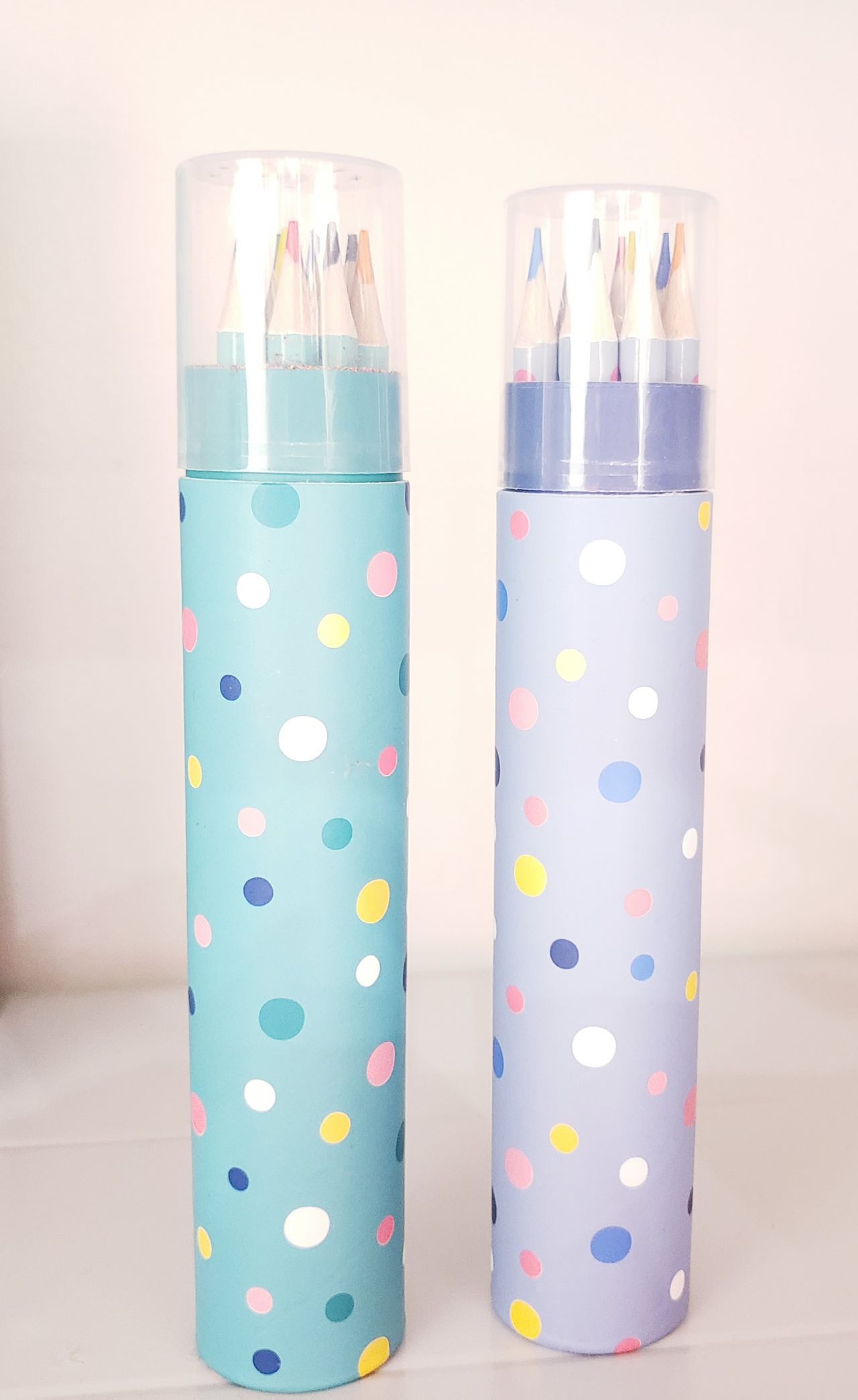 パステルカラーが可愛い水玉模様の筒のケースに入った色鉛筆です!!