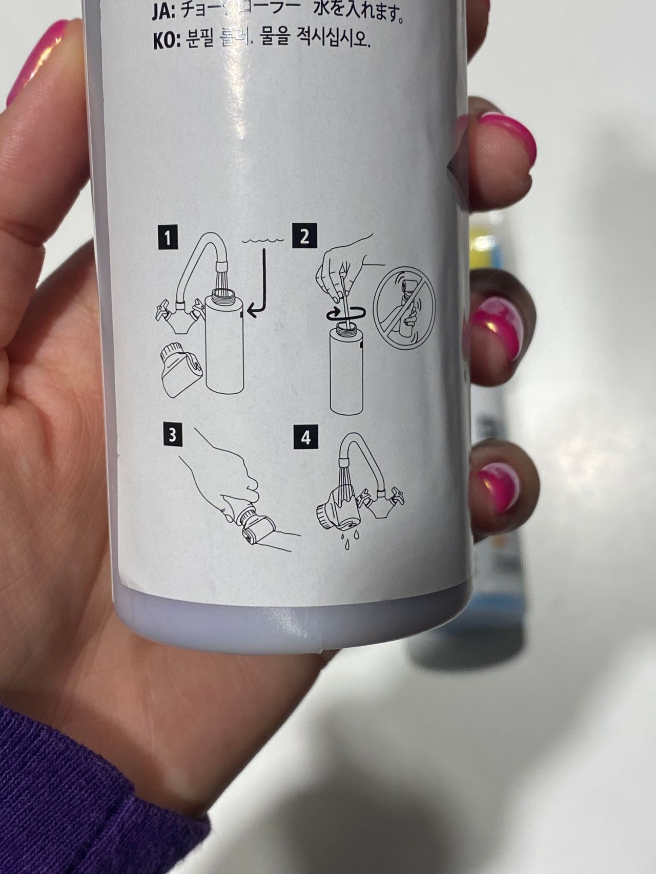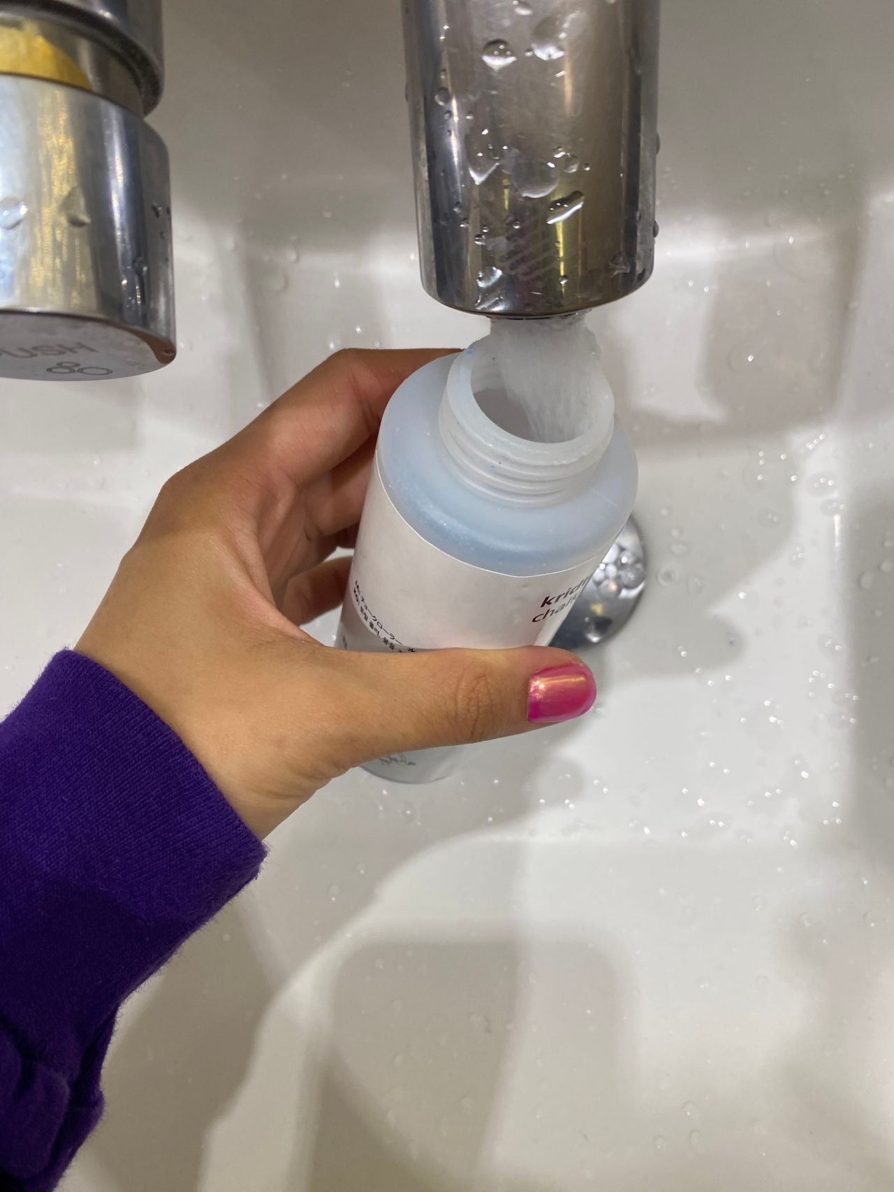 容器を斜めにすると液が漏れるので、勢いよく真下に向けて雑巾などに試し出しをします!