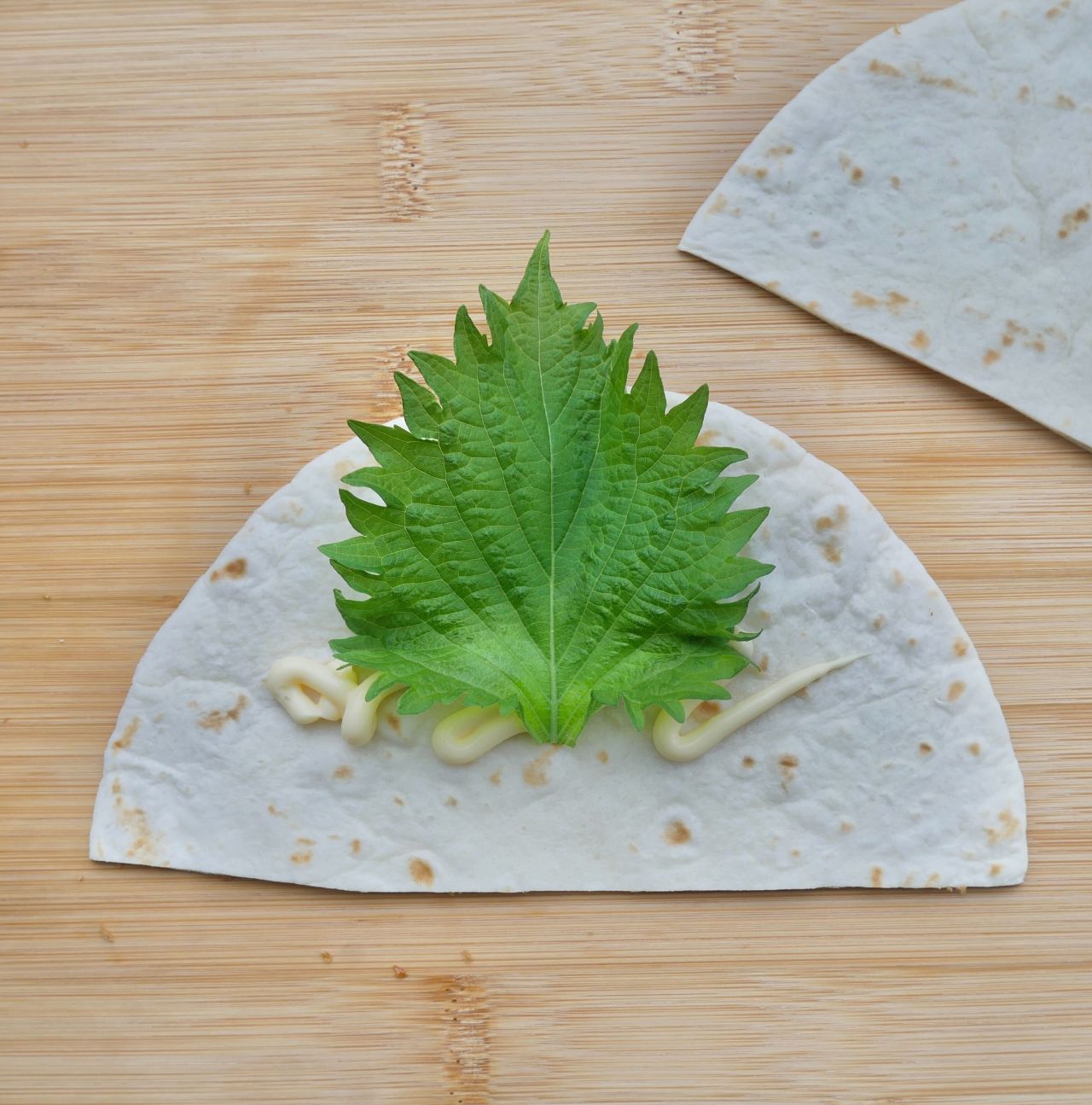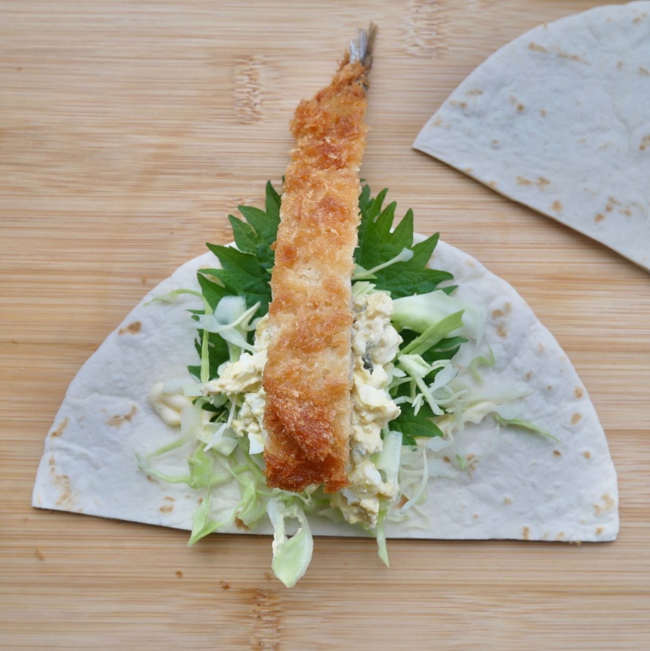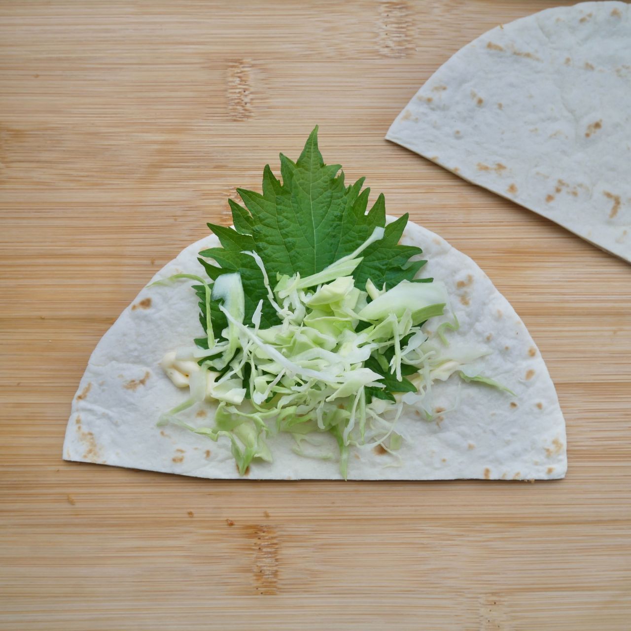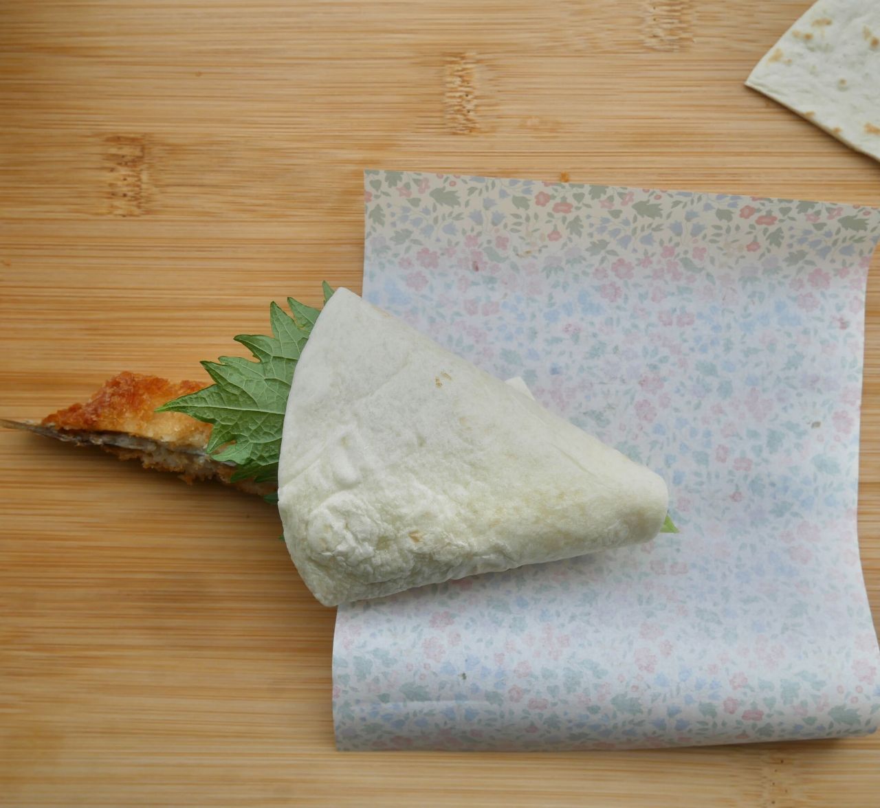 ・マヨネーズ少々、紫蘇の葉1枚、千切りキャベツ、タルタルソース、アジフライ1切(尻尾が付いてる部分)の順にトルティーヤの上に乗せていく。