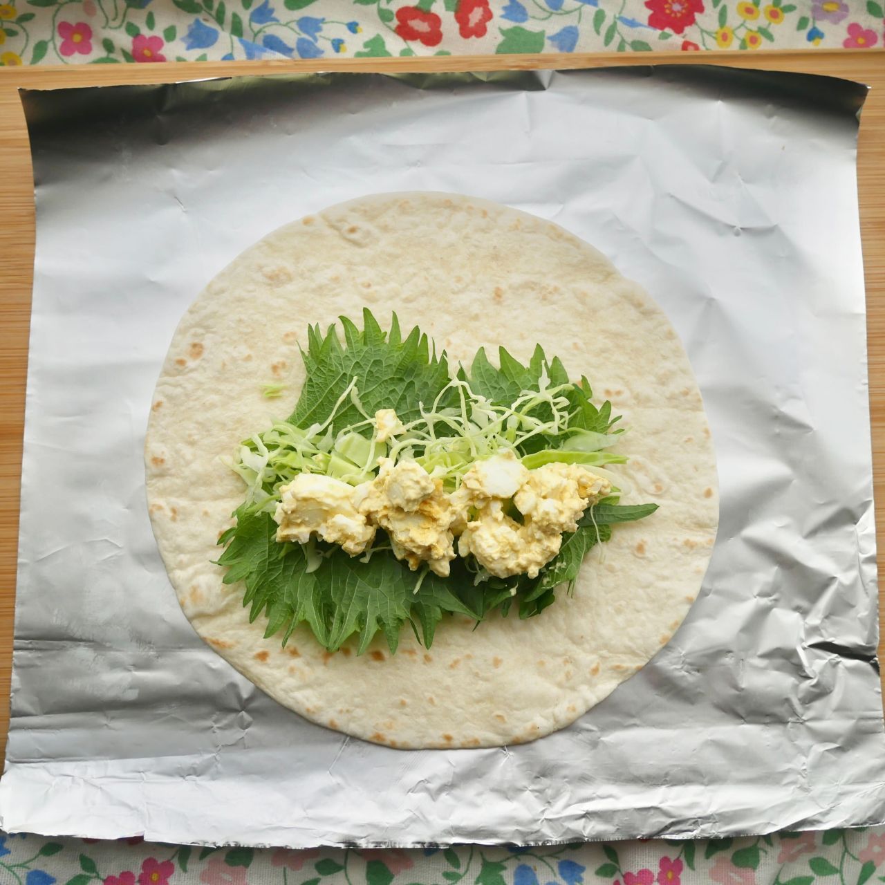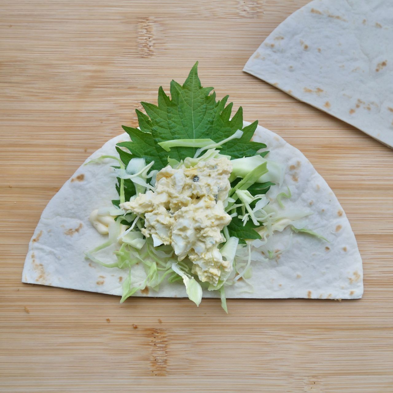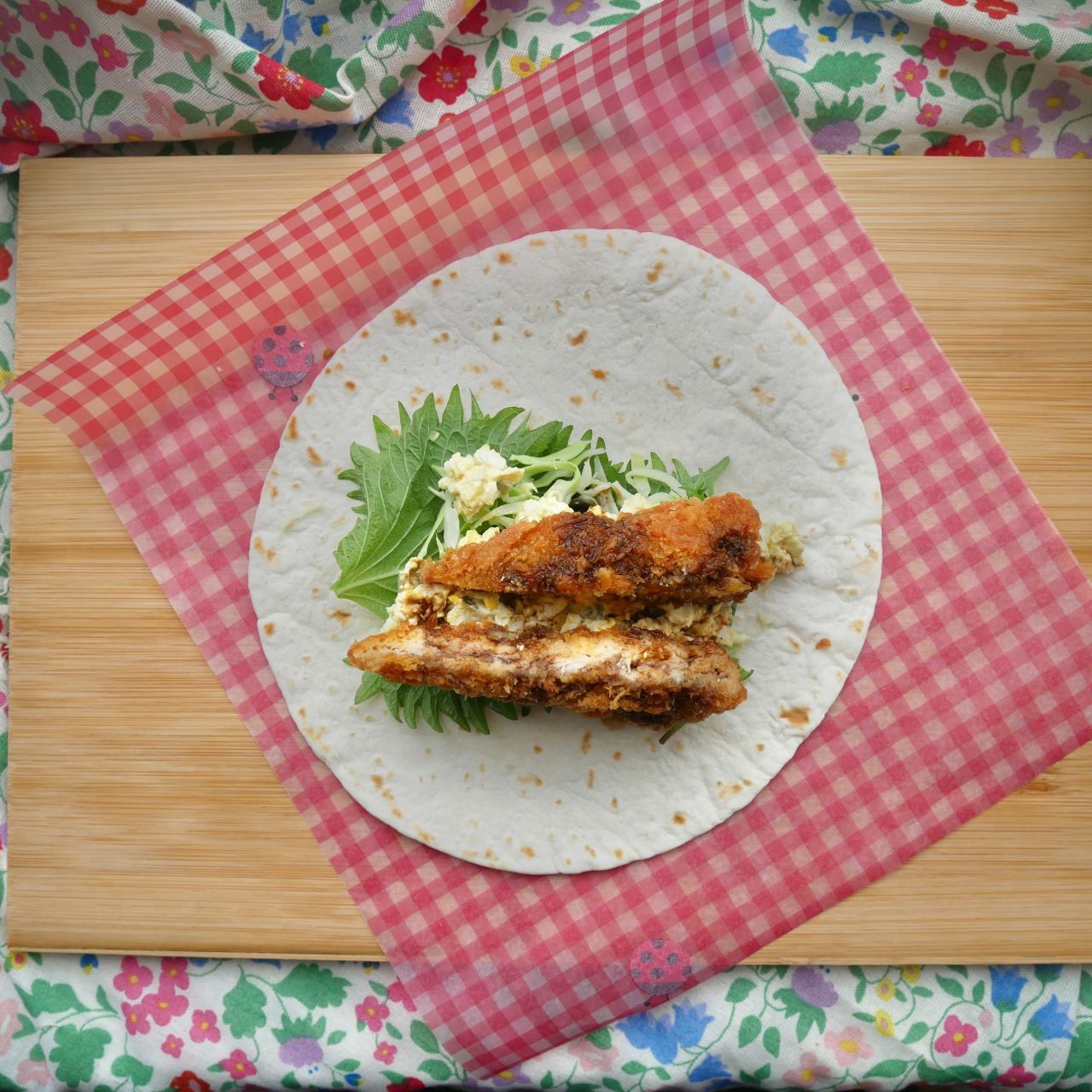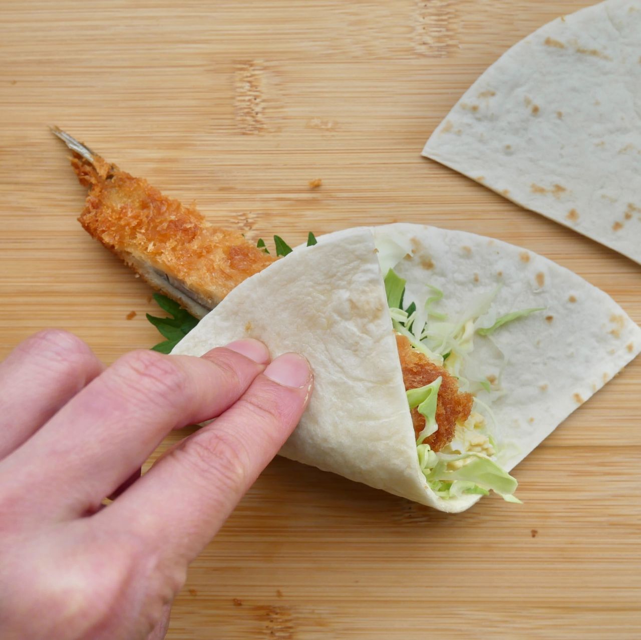・マヨネーズ少々、紫蘇の葉1枚、千切りキャベツ、タルタルソース、アジフライ1切(尻尾が付いてる部分)の順にトルティーヤの上に乗せていく。