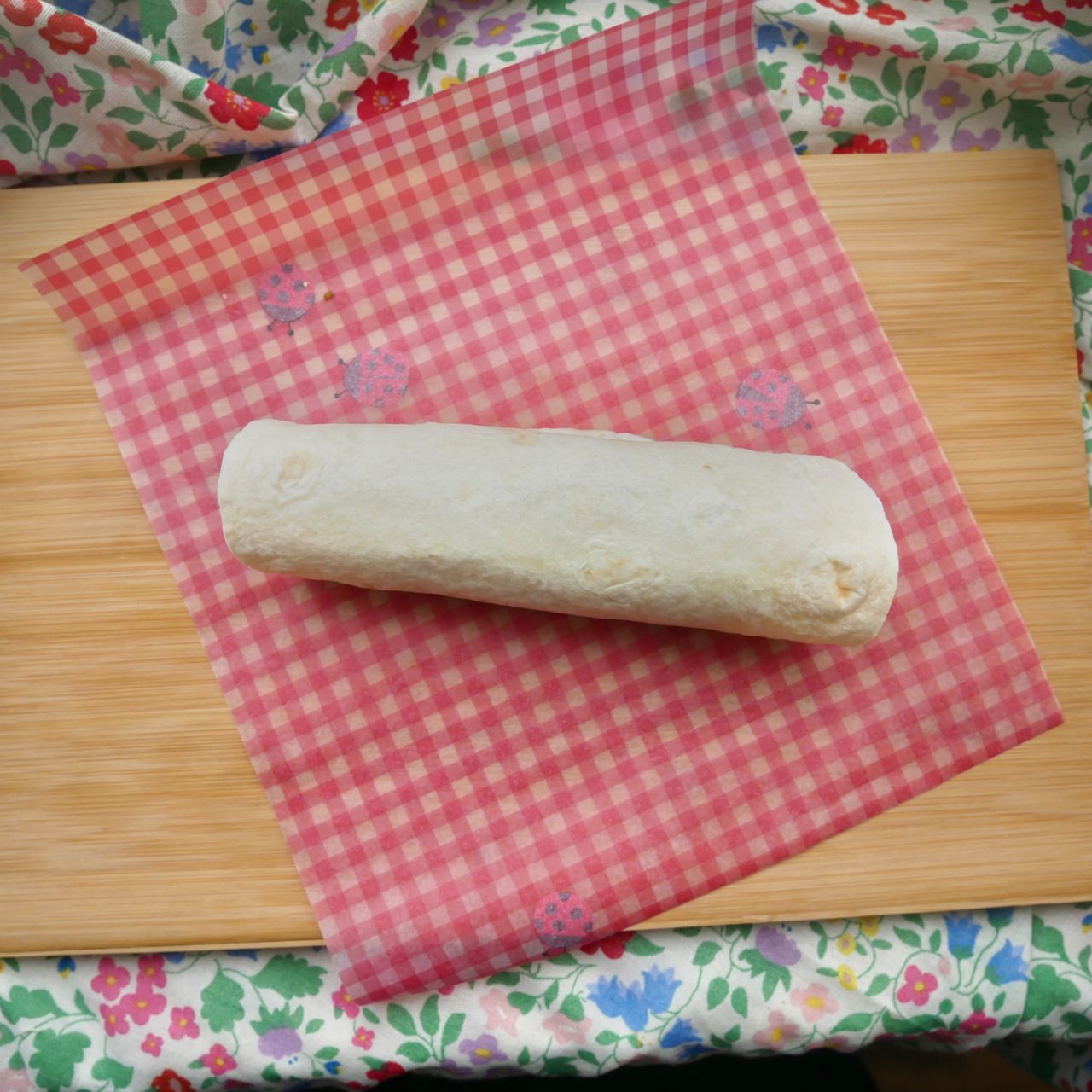 ・アルミホイルの時と同様に具材、ソースをかけトルティーヤを手前から巻いていきます。