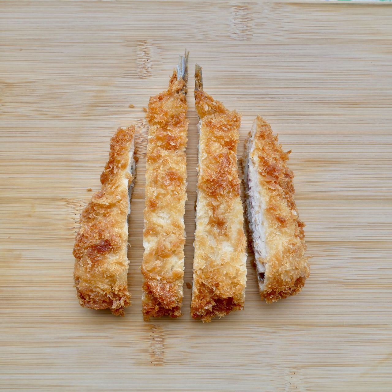 ・アジフライは尻尾を残したまま縦に4等分にカットしておく。