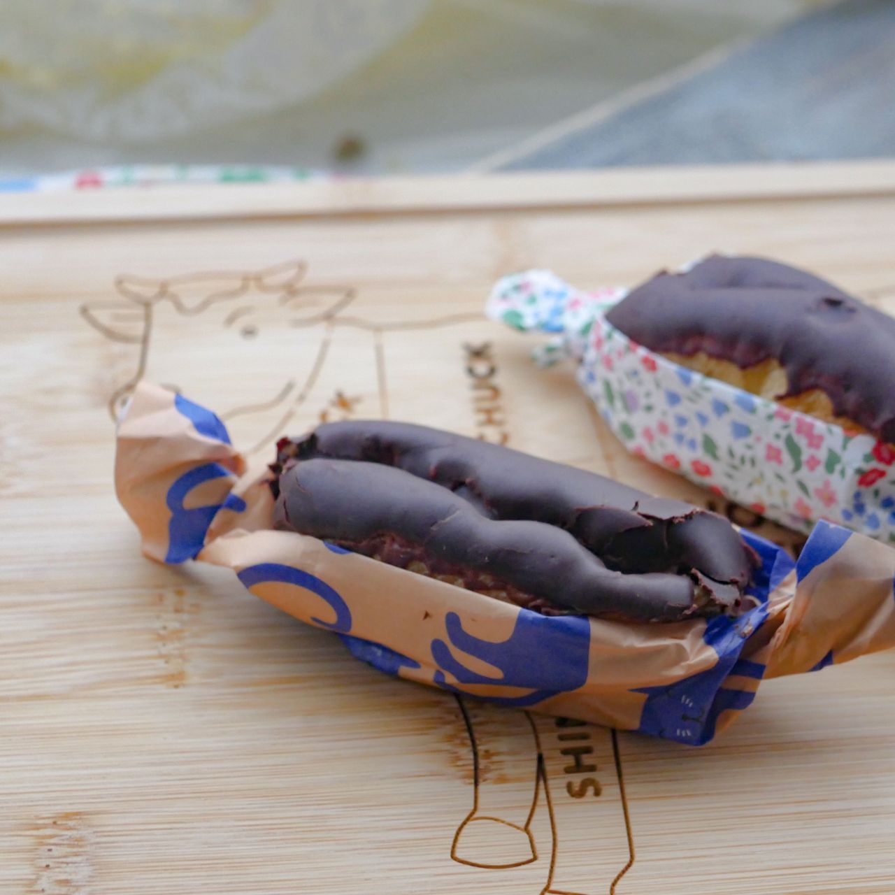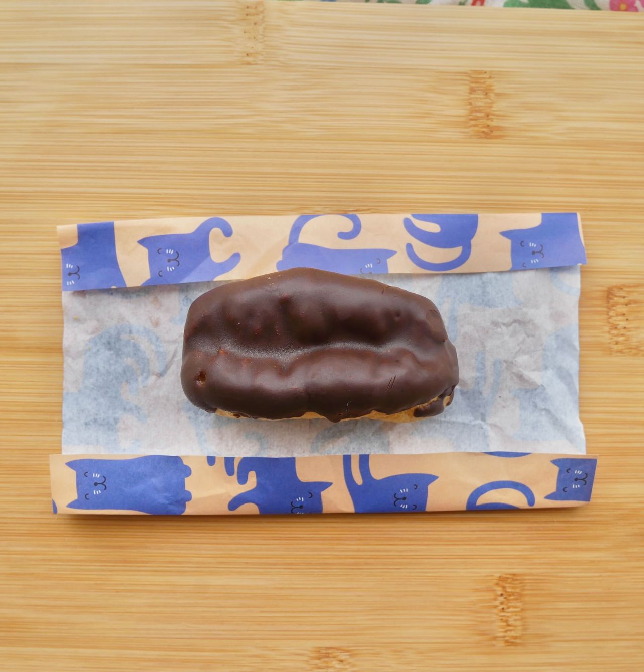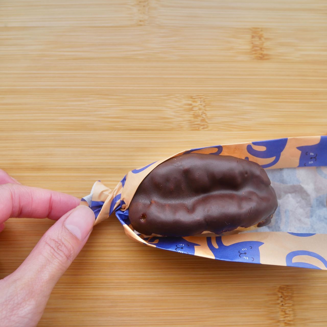 ・サンドイッチペーパーを少しくしゃっとして、真ん中にミニエクレアを置いて、ペーパーの上下を少し折り、両端をキャンディ包みにする。
