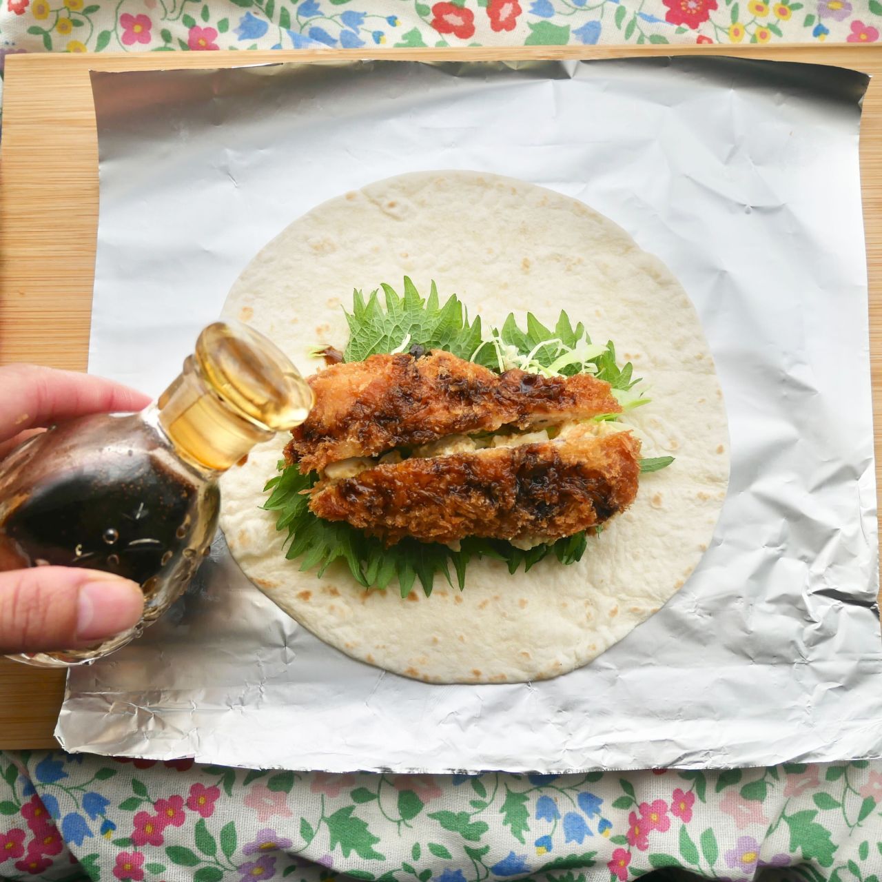 ・真ん中にトルティーヤを1枚置き、マヨネーズ少々、紫蘇の葉2枚、千切りキャベツ、タルタルソース、アジフライ2切れを真ん中に順に乗せ、最後にお好みのソースをかけます。