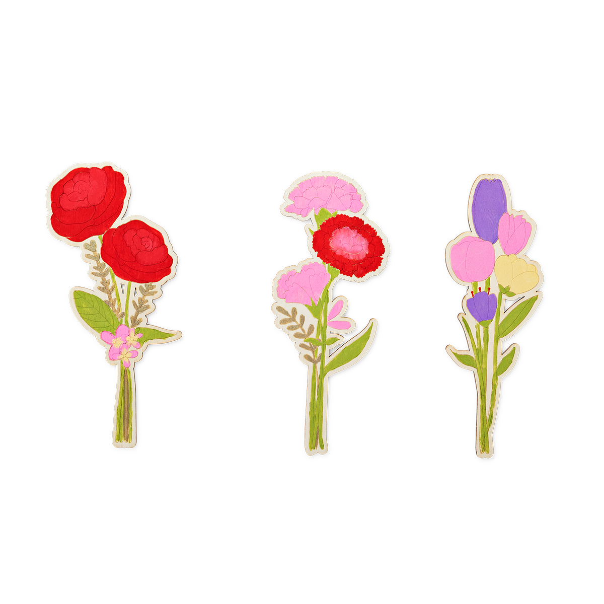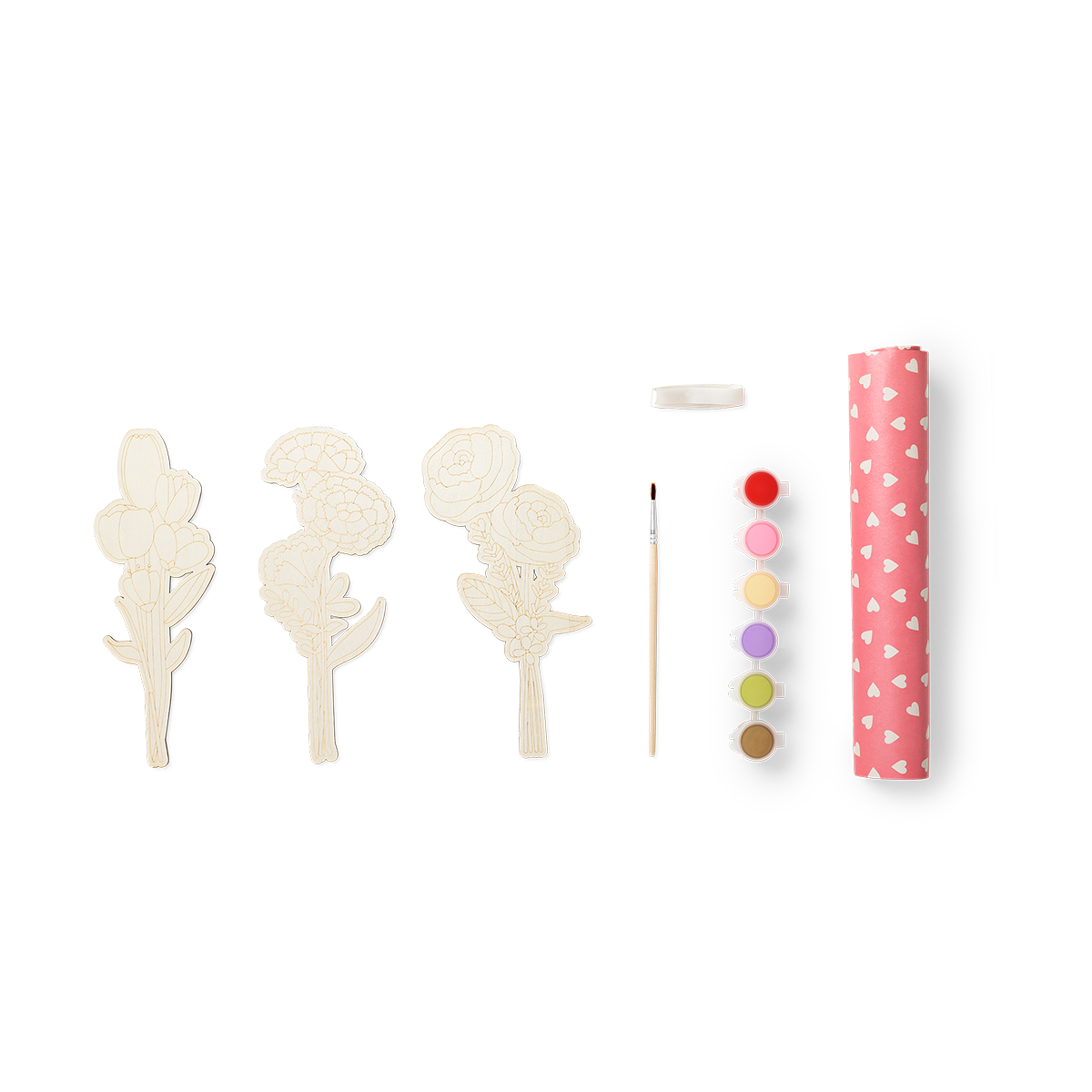 セットになっているのは、花のかたちのウッドピース、絵の具、筆、リボン、ラッピングペーパー。