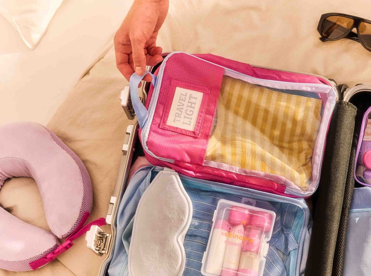 圧縮オーガナイザーバッグは、カラフルなピンクとブルーのデザインがポイント。